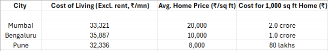 – Bengaluru has steeper living expenses (about Rs. 35,900/month) but this is offset by good income earning potential in IT and the city's various start-ups. Peripheral areas like Whitefield and Sarjapur have homes available at prices between Rs. 7,000–10,500/sq ft.